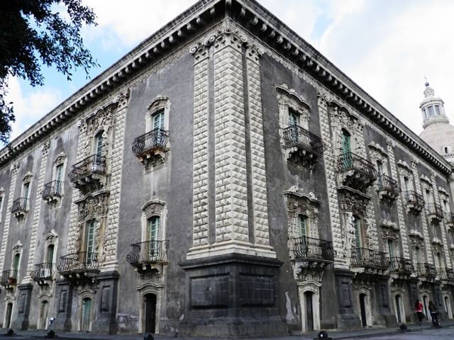 Si articola su tre edifici dal medesimo stile posti a semicerchio di fronte all’ampia piattaforma dalla quale si eleva la chiesa di San Nicolò all’Arena con la sua facciata incompiuta e le colonne come mozzate. Nel ‘700 l’impatto doveva essere assicurato. Oggi la piazza è invasa dalle macchine (a Catania la mancanza di parcheggi di servizio al centro storico è drammatica) ed i palazzi, bisognosi di restauri, ridotti alle ombre di loro stessi.
