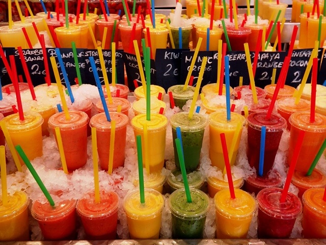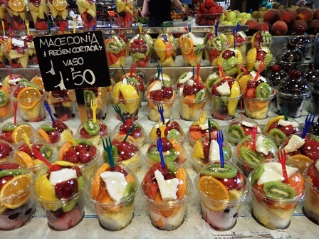 Qui al Mercato della Boqueria a farla da padroni sono frutta (quella tropicale è spettacolare) e pesce (del resto siamo al mare). I banchi non vendono solo il prodotto ma offrono anche spremute, macedonie, frullati, granite.