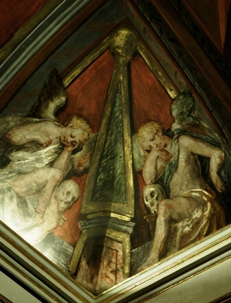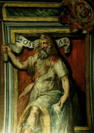 La dedicazione del tempio alla Passione di Nostro Signore emerge chiaramente dagli affreschi. Basti osservare con attenzione gli angeli dipinti nel presbiterio i quali recano tra le mani gli strumenti della Passione (ad esempio, quello immediatamente sopra l’altare mostra la corona di spine). La navata è dipinta con tre scene bibliche (sacrificio di Isacco, la serpe che brucia nel deserto, Giona e il mostro marino) che vogliano simboleggiare i tre momenti della Passione, della Crocefissione e della Resurrezione. Sui lati della volta, sono raffigurati i Profeti di Israele. Lo stile e la concezione si ispirano alla Cappella Sistina.
