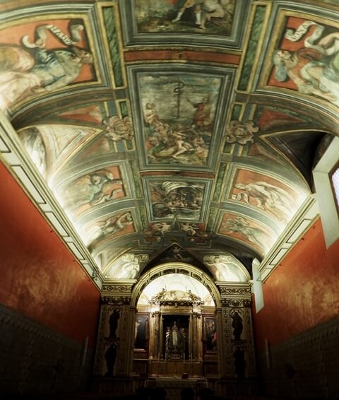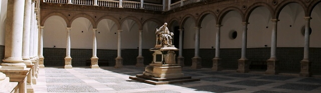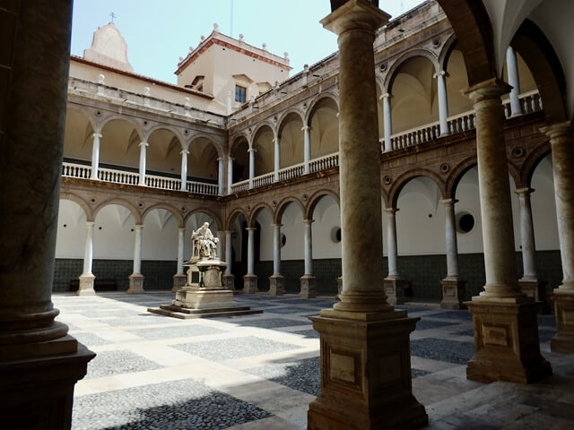 Dunque parliamo di un’opera rinascimentale ed, infatti, venne realizzata tra il 1586 ed il 1611. Di quell’epoca il Collegio del Corpus Christi conserva l’importanza delle architetture e la preziosità degli affreschi. Tutto ruota intorno al grande chiostro con due ordini di colonne ed al centro la statua di San Giovanni de Ribera, seduto e pensoso.
