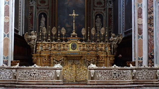 Poi, non bastando, sessanta anni dopo, davanti all’altare viene posizionata una formidabile balaustra in marmo policromo trionfo dello sfarzo barocco.