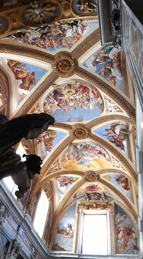 Le pareti dell’abside ospitano invece tele di alcuni dei più noti caravaggeschi napoletani Jusepe de Ribeira, Battistello Caracciolo, Massimo Stanzione. Diversi decenni sono passati dagli affreschi del Cavalier d’Arpino e siamo ormai in pieno XVII secolo.