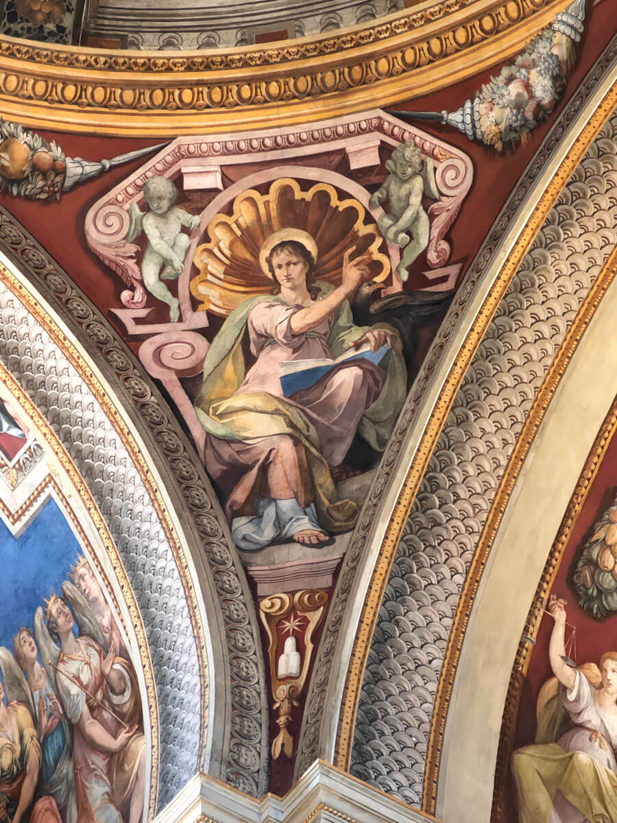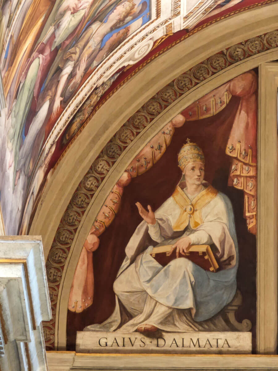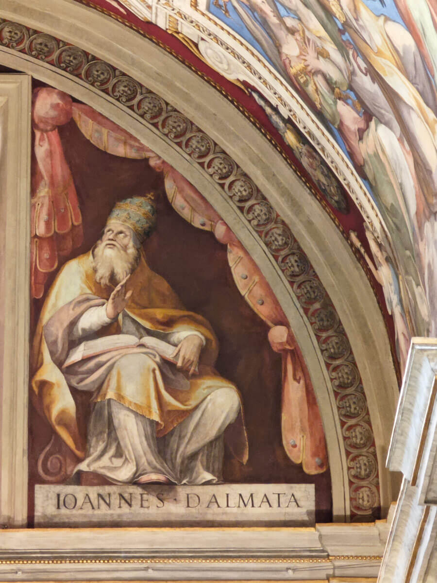 Nelle lunette della parete di fondo, i ritratti di Caio I e Giovanni IV di Avanzino Nucci: papi dalmati rispettivamente del III e VI secolo d.C..
