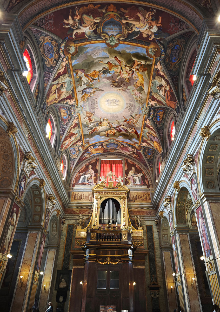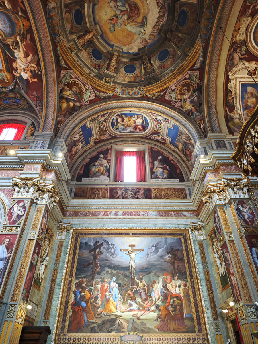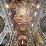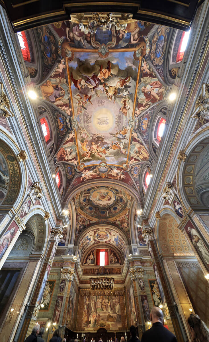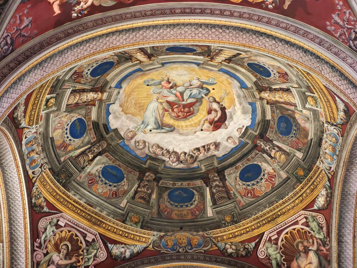 La cupola posta al centro tra i transetti è, in realtà, un’illusione ottica come andrà di moda nei secoli successivi. Insomma, un’anticipazione di capolavori straordinari come la Gloria di Sant’Ignazio di Andrea Pozzo.
