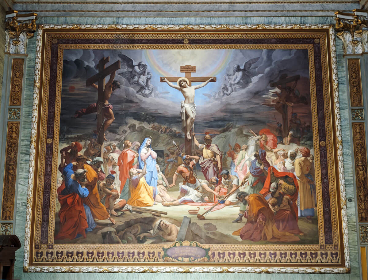 Agli estremi dei transetti, sono dovuti a Pietro Gagliardi, e dunque ottocenteschi, i due grandi affreschi del Calvario (o della Crocifissione), a sinistra, e dell’Adorazione dei Magi, a destra.