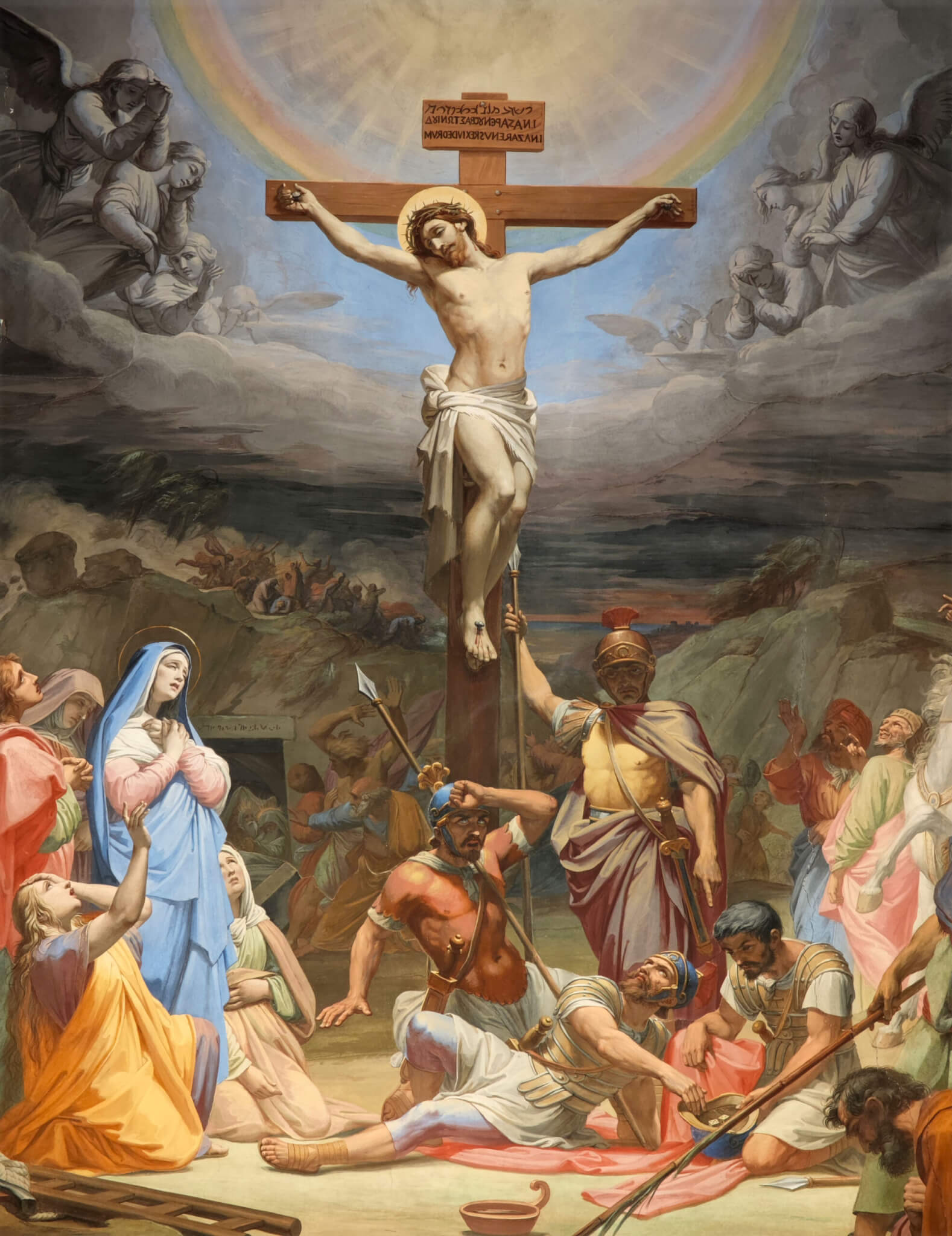 Il cartiglio posto al centro della cornice dell’affresco verso la controfacciata riporta il committente (la già citata Congregazione) e l’anno (1850). Il cartiglio sul lato opposto riporta invece la frase: “Aspicientes in auctorem fidei, qui proposito sibi gaudio, sustinuit crucem” ovvero “Rimirando nell’Autore di nostra fede, il quale ricusato il gaudio propostoglisi, sostenne la Croce” riferentesi a Gesù.