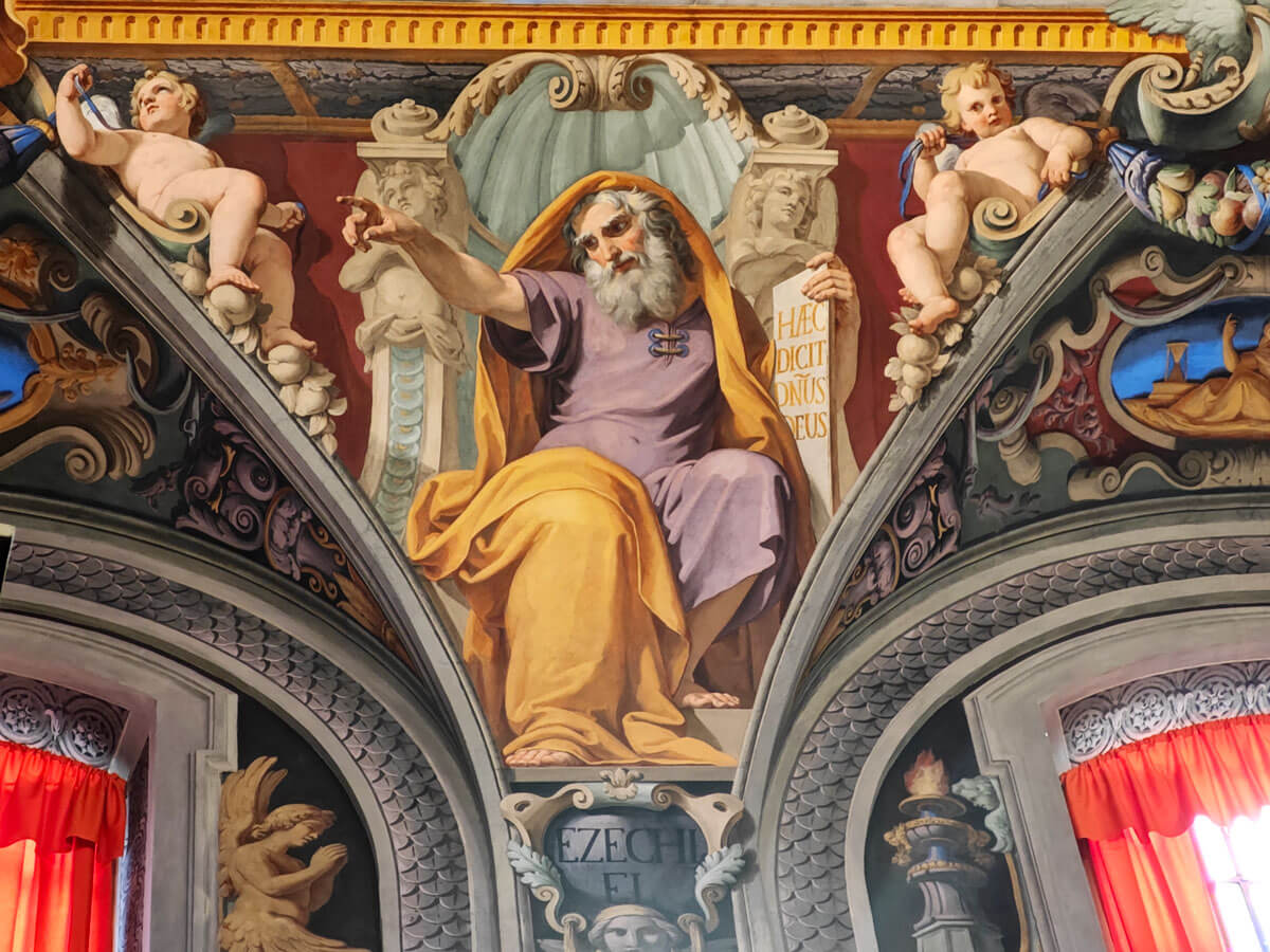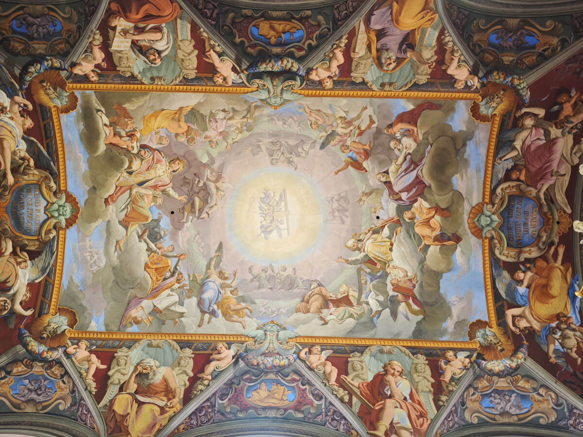 Di Giovanni Guerra è il Trionfo della Trinità al centro della cupola mentre sono di Paolo Guidotti i peduncoli della cupola con i quattro evangelisti.
