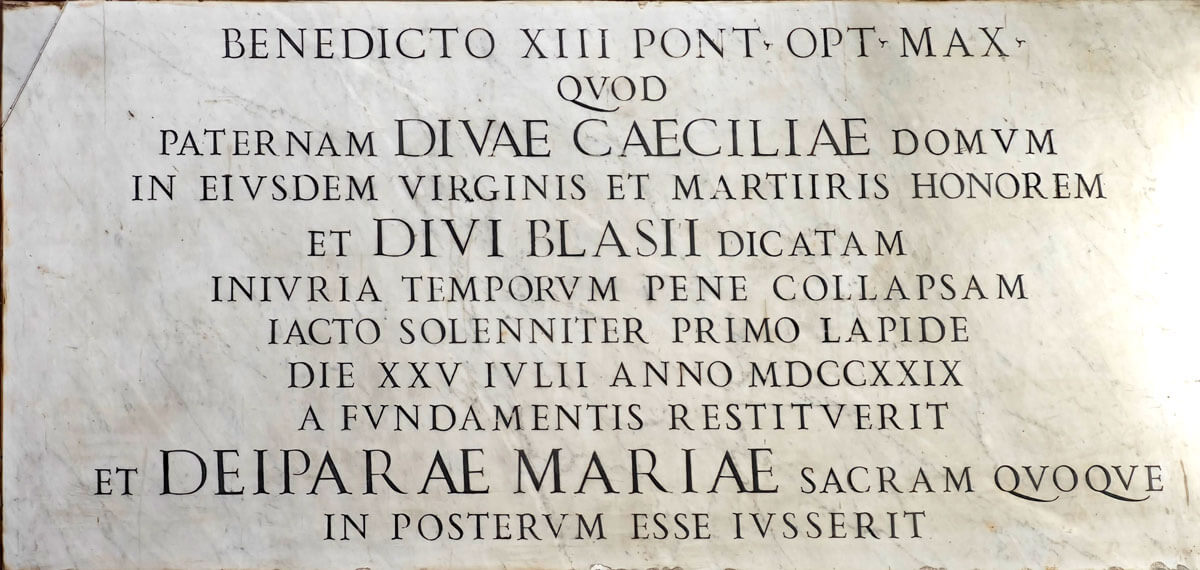 • Papa Benedetto XIII Orsini ordina all’architetto Filippo Raguzzini di riedificarla dalle fondamenta. Una lapide ancora oggi in sito ricorda questo evento datato al 1729 e ricorda anche come la chiesa fosse dedicata a Santa Cecilia ed a San Biagio