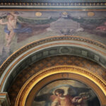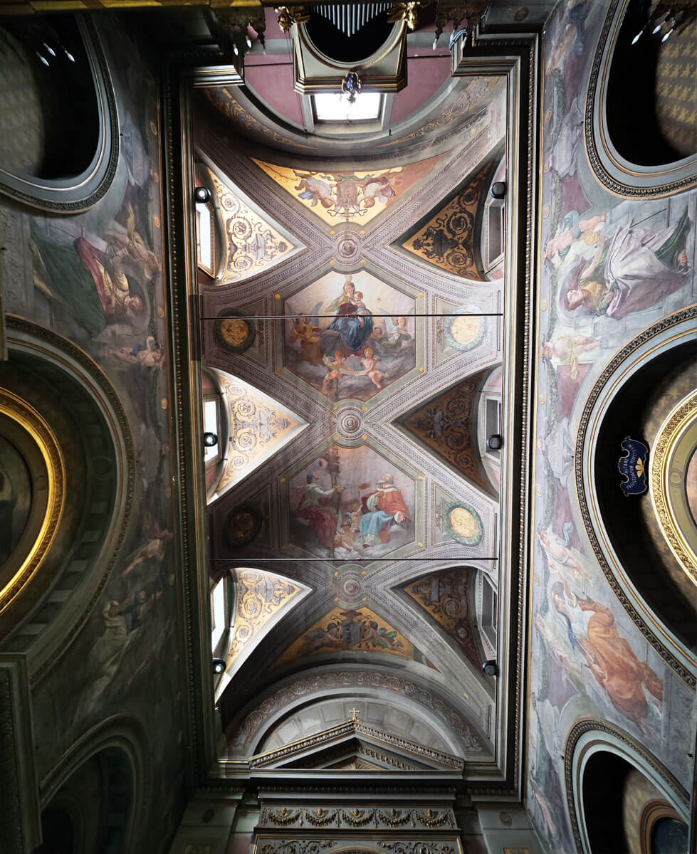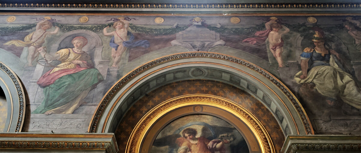 All’inizio ed alla fine degli affreschi della volta due stemmi. Uno è quello dei Borghese, che potrebbero aver concorso a finanziare l’opera, l’altro uno stemma cardinalizio da identificare.