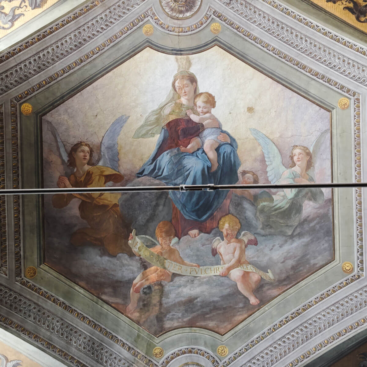 La volta della navata è affrescata con due grandi pannelli esagonali. In quello verso l’altare la Vergine. In questo esagono troviamo la frase Ego mater pulchrae dilectionis (et timoris et agnitionis et sanctae spei) ovvero Io sono la madre del bell’amore, (del timore [di Dio], della conoscenza e della santa speranza), iscrizione riferita alla Vergine.